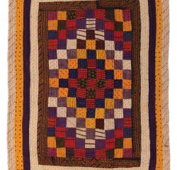 Patchwork rallis range from very simple designs to extremely complex, multidimensional patterns. The simplest type features a plain center field—usually a single fabric, occasionally a colorful printed piece—surrounded by a simple border of stripes or stripes paired with a patterned band. These quilts are called lassi or "simple quilts." Their quilting lines are very close together, about ¼ to ½ inch apart, and makers sometimes use different colors of thread to add patterning to the surface. These are considered everyday quilts.