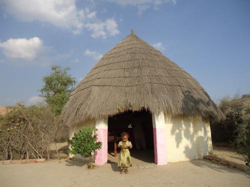 This little girl is standing in front of her family chaunro, a round mud brick home. In hot weather, the family will often sleep outside. This type of house is used in the desert regions of both Pakistan and India.
