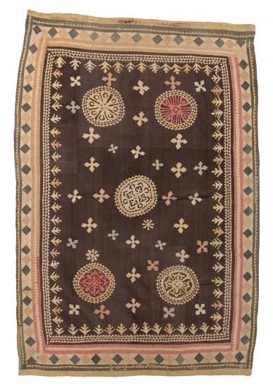 This quilt from middle Sindh follows what locals call a “new design” due to the fact that the center field is a single piece of cloth with a variety of applique designs spread across it. The colors are those favored by the Jogi snake charmer people.