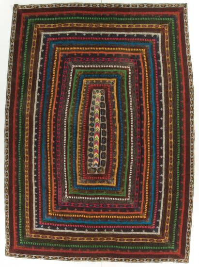 The nomadic communities from Pakistan and India are known for making quilts that are quilted using both running stitches and complex decorative stitches, both in colorful designs. Black is frequently a background color. This example was made in the Jogi snake charmer community. Jogi quilts are often confused with quilts made by members of the nomadic Saami community, which also feature intensive stitching, often on a dark ground.