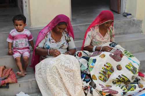 In the western part of Rajasthan, many women make quilts and quilt tops for sale. Patterns with applique, here with elephants and floral designs, are particularly popular.