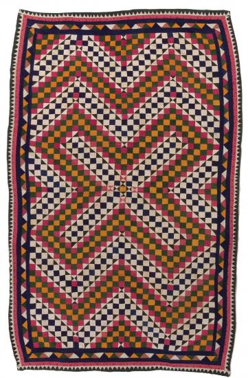 Long ago, a creative quilter figured out how to turn a quilt into a game board. In a game using small pebbles, the players start at the red square in the center and move their markers around. The game is called chopar; it is related to what in English is called parcheesi.