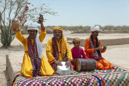 Musicians wearing brightly colored clothing sit on brightly colored quilts in the Cholistan Desert of Pakistan.