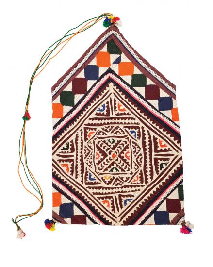 Two of the borders on this ralli bag, or bujki, are edged with white, machine-produced trim.