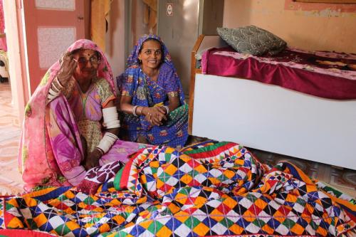 Displaced by war in 1972, this Meghwal family moved from Pakistan to settle in Kutch, India. Hanjuben, aged 80 in this photo, had pieced traditional rallis when she was younger but now makes quilts using the preprinted purchased fabric.